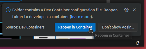 Launch the dev container by clicking "Reopen in Container" on the popup.